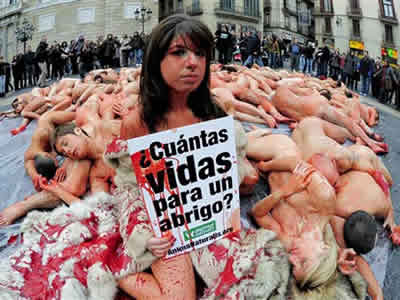Grupo de manifestantes tiram a roupa e se pintam de vermelho para simular sangue na praça de São Jaime, em Barcelona, no leste da Espanha. Os ativistas protestaram contra os maus tratos a animais, carregando placas dizendo “quantas vidas por um casaco”, para questionar a extração de pele para abrigos contra o frio. O grupo responsável pelo ato chama-se “Anima Naturalis”. (Foto: Josep Lago / AFP Photo)