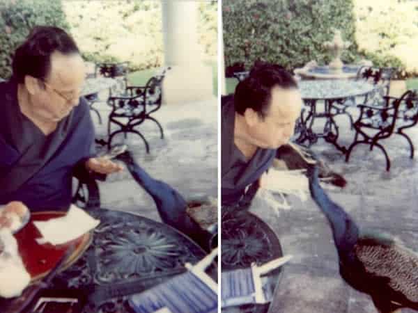 Na primeira foto, Bolaños – o eterno Chaves – dá comida para o pavão-real diretamente de sua mão.