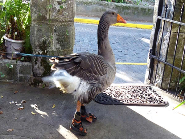 Os donos do ganso Gator, Bob e Lauree Strouse, estavam tão preocupados com as andanças do animal pelas ruas de St Augustine, na Flórida, que resolveram desenvolver um par de sandálias para proteger do concreto quente das calçadas.