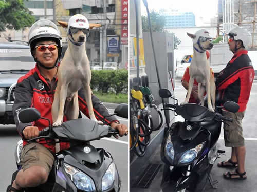 O filipino identificado apenas como Gilbert foi flagrado levando seu cão de estimação chamado “Bogie” pelas ruas de Manila, capital das Filipinas, enquanto passeava de scooter. O animal, inclusive, usa capacete.