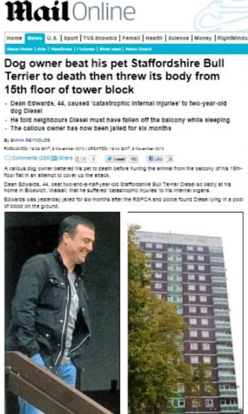 Dean Edwards chocou a vizinhança da região de Walsall, na Inglaterra, onde vivia. O homem de 44 anos espancou seu cachorro de estimação até a morte. Depois, na tentativa de encobrir o crime, jogou o corpo do animal da varanda de seu apartamento, no 15º andar de um prédio.