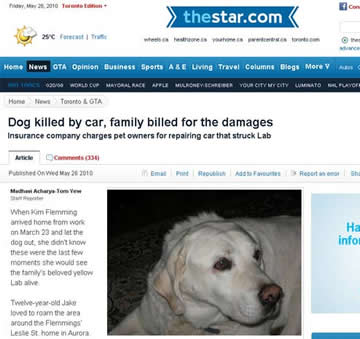 A canadense Kim Flemming recebeu uma conta de 1.732,80 dólares canadenses (cerca de R$ 3 mil) de uma companhia de seguros em Toronto, no Canadá, após seu cachorro de estimação ter sido atropelado e morto por um carro, segundo reportagem do jornal “Toronto Star”.