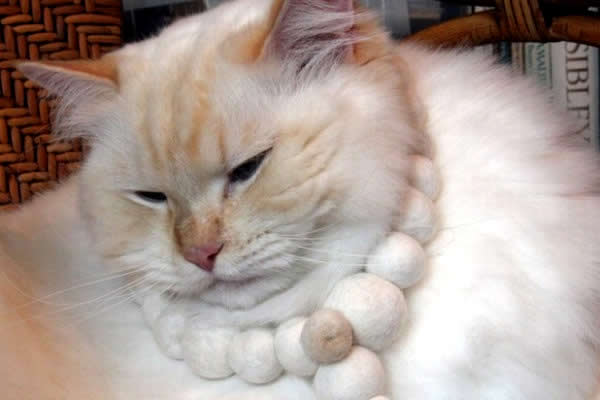 Segundo ela, as bolas tinham uma aparência que lembrava grandes pérolas brancas, o que serviu de fato de inspiração para criar joias a partir delas. “É uma forma de mostrar meu amor por este gato especial”, disse. Um colar cheio delas, como na foto acima, leva em média de dois a três meses para ficar pronto.