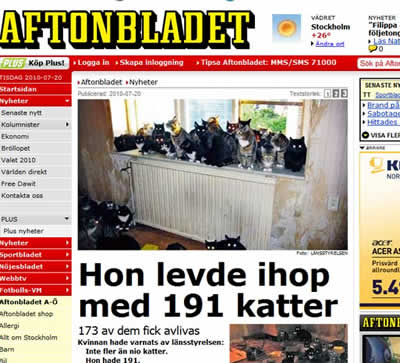 A família de quatro pessoas, uma mulher de 60 anos, sua mãe, a irmã e seu filho, vivia com 191 gatos em Botkyrka, a 25 km ao sudoeste de Estocolmo.