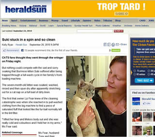 Liz só descobriu que a gata tinha ficado presa quando foi retirar as roupas lavadas da máquina. Assustados, a mulher e seu marido, Tony, levaram o felino até uma clínica veterinária em Kensington, na Austrália. Para o veterinário Sam Snelling, “Suki” só sobreviveu porque a máquina era com tampa frontal.