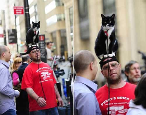 Um homem foi flagrado caminhando com um gato sobre a sua cabeça em Nova York (EUA). A cena inusitada foi vista próxima ao prédio onde o ex-diretor-gerente do Fundo Monetário Internacional (FMI) Dominique Strauss-Khan está em prisão domiciliar.